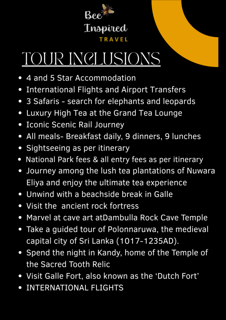 Partnering with Inspiring Vacations, join Steph & Sandra on all inclusive and fully escorted, small-group tour of Sri Lanka, guided by a local expert. Experience three safaris, a breathtaking scenic train journey, high tea, national parks, and cultural wonders. With all breakfasts, 9 dinners and 9 lunches, all tours & entrance fees included, your journey ends with a luxury beach escape at the 5-star Radisson Blu Resort, Galle. Designed by Inspiring Vacations and Bee Inspired Travel. International flights included!